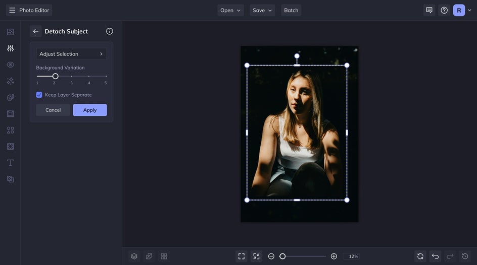 To use Detach Subject, simply click on the tool and watch as your subject is automatically separated from the background. Then, you can move it around as you please. Choose from the available background variations to seamlessly fill in the empty space behind your subject. Keep the Keep Layers Separate box checked if you want to continue manipulating the layers after applying the tool. Finally, click Apply when you're satisfied.