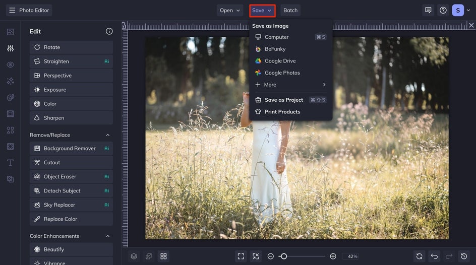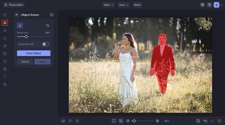 While BeFunky’s Clone tool is great for precise edits, it relies on having a similar background to copy from, which can be tough in busy scenes. The Object Eraser goes a step further by using AI to intelligently fill in the space left behind. It’s one of the most powerful tools in the Photo Editor, and the only one of its kind that works seamlessly with high-resolution images.