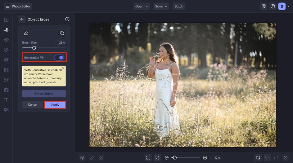 When you're satisfied with your selection, click Erase Object to remove your ex entirely – like they were never there. For more complex backgrounds, you may want to toggle Generative Fill. This option uses AI to produce accurate details to blend seamlessly with foliage, cityscapes, and more.