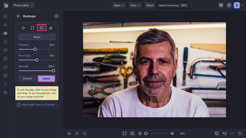 The Smudge option is great for when you want to exaggerate or stretch something in the image. Simply select the Smudge button and adjust your brush, then drag the cursor to your desired result. Once you are satisfied, click the Apply button to apply the changes.