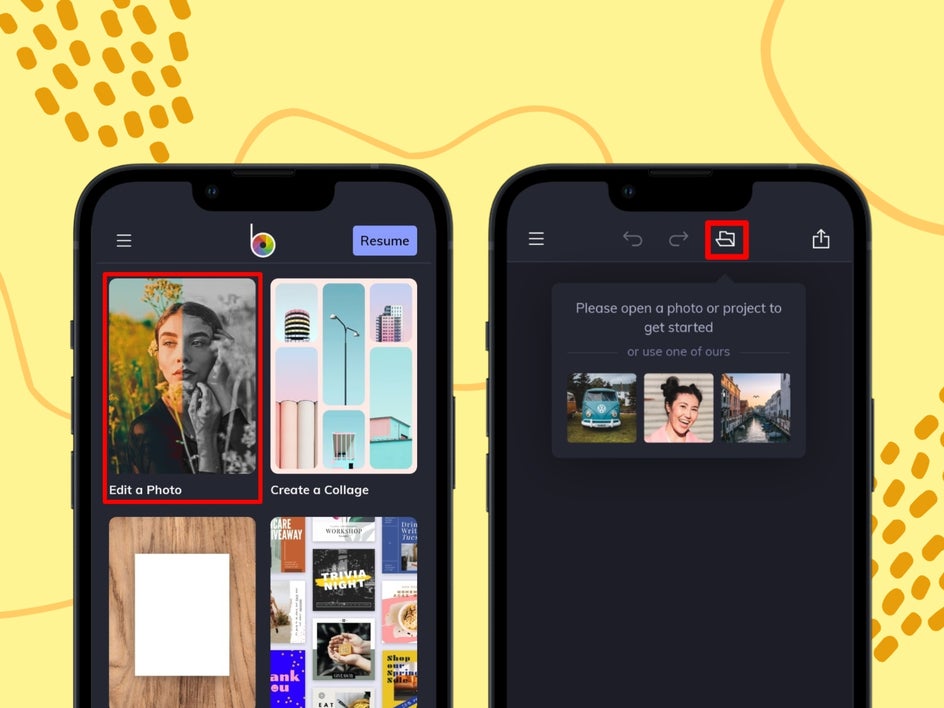 Tap Edit a Photo to begin. Then, tap the folder icon at the top of the screen to open the old photo you wish to restore.