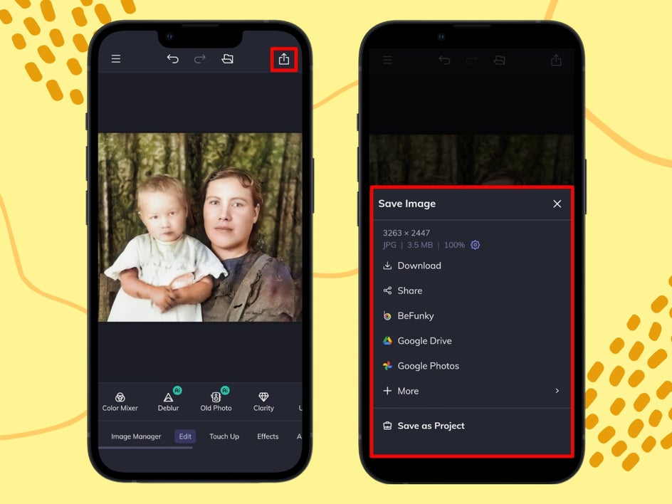 Once you’ve finished editing your vintage photo, all that’s left to do is save it. The huge advantage of editing your old photos on your mobile is the ability to then share it quickly and easily with your loved ones.