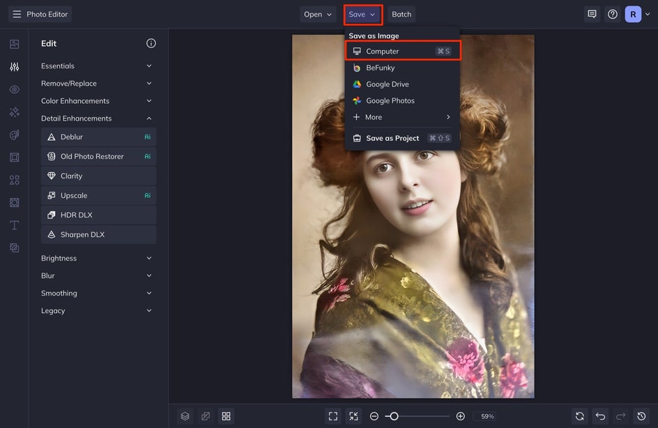 When you've finished editing, click the Save button at the top of the screen and then select Computer. Save your image as a high-quality JPG.