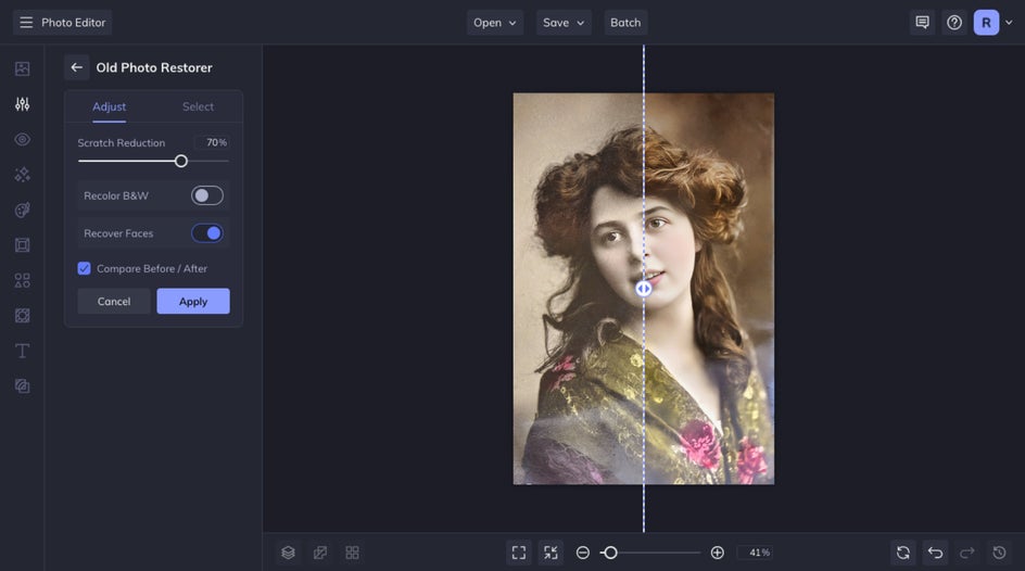 The Old Photo Restorer is located in the Edit tab and under the Detail Enhancements drop-down. This tool utilizes the power of AI to remove scratches and restore sun-damaged photos. Click on the tool and in seconds you’ll see a before and after slider to compare the original to the results.