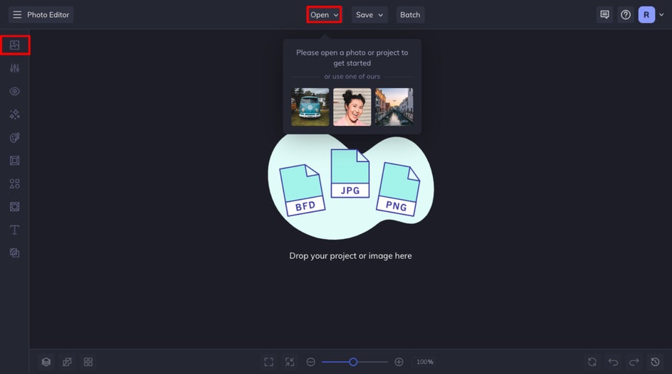 To get started, head to BeFunky’s Old Photo Restorer and upload your photo by selecting Open and then Computer at the top of the screen. You can also drag and drop an image file directly onto the canvas, which is my preferred method.