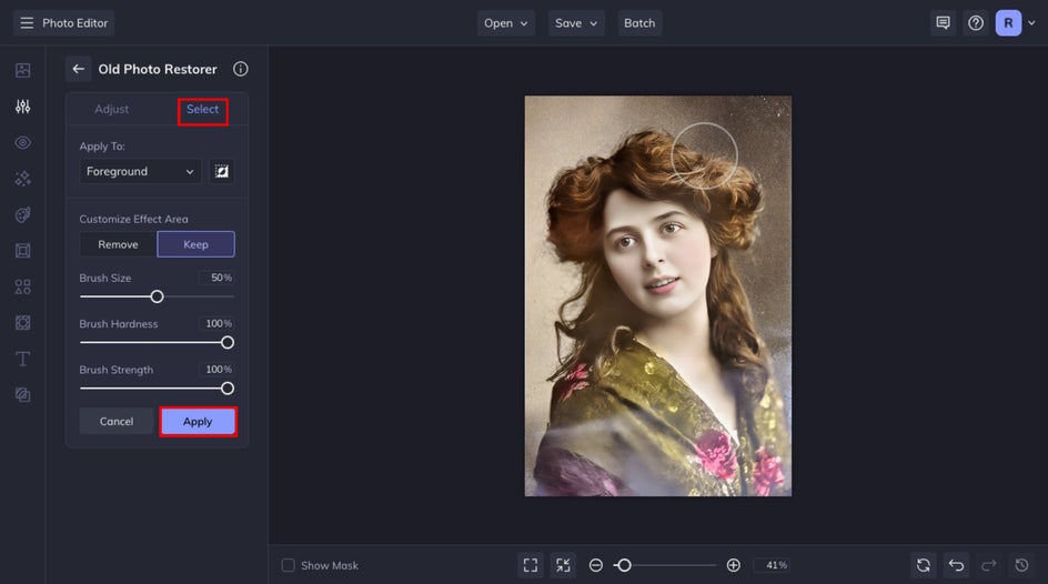And if you'd like to apply the Old Photo Restorer selectively, head over to the Select tab. From here, you can control what areas of the photo are restored. This is a good choice if you'd like to enhance facial features while preserving the vintage look of a photo.