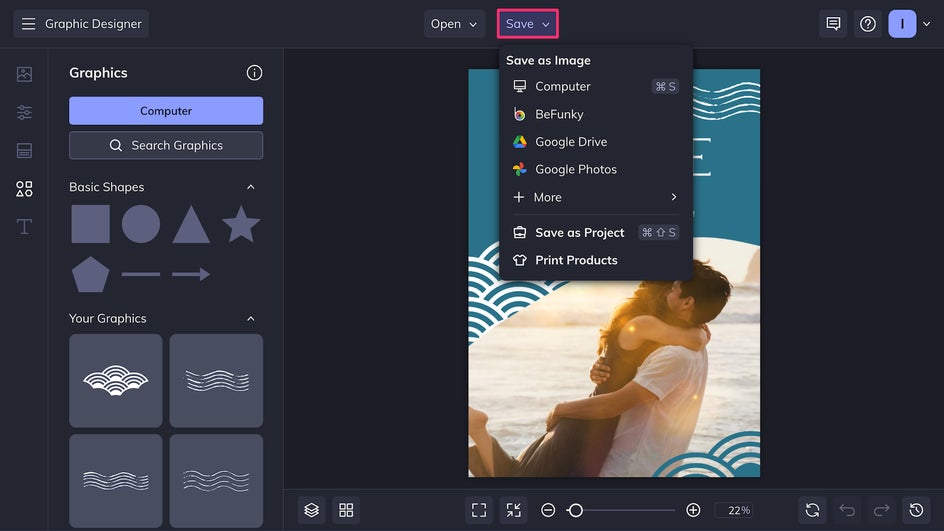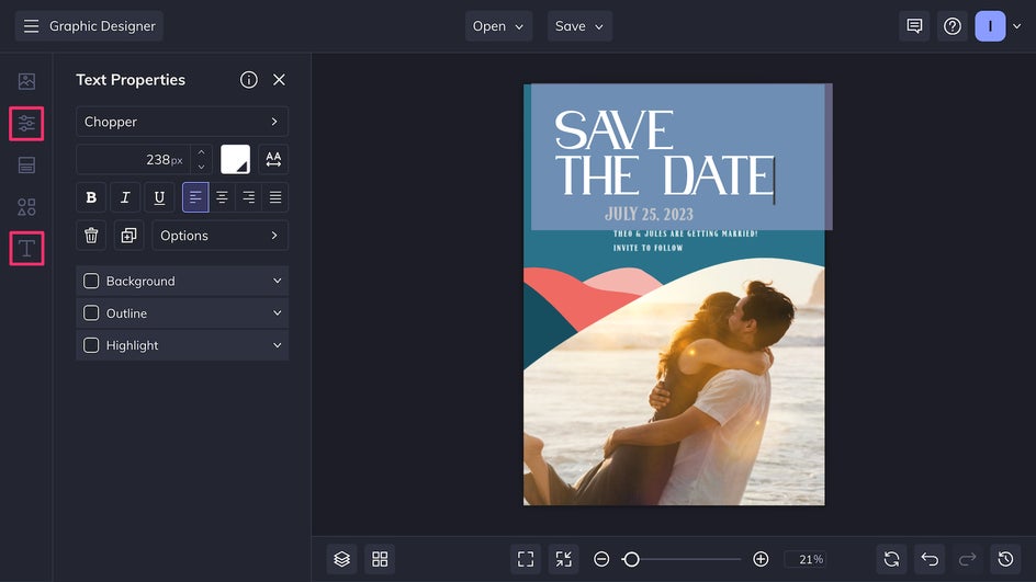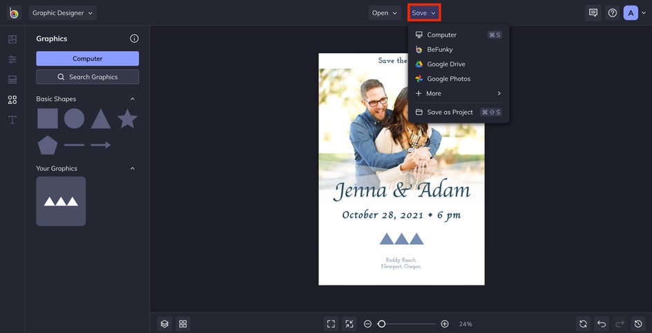 Finally, give the card a final pass, making sure everything is aligned and that all the text is legible. Then, save and export it as a print-quality PDF for sending physical cards, or a high-quality PNG for digital sharing. And don't forget that you can print your cards with Zazzle – directly from BeFunky. To make edits in the future, or to copy elements and streamline future wedding designs, save the file as a project.
