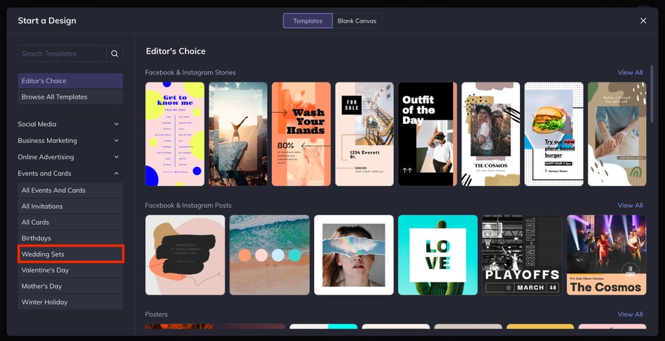 A nature-inspired wedding never goes out of style – think watercolor florals, hand-lettered fonts, and earth tones like blush, sage, and terracotta. The Designer has plenty of different nature-inspired wedding sets to choose from. When adding a photo like an outdoor engagement shot, combine a Warmer Tones filter with a paper texture for a more rustic, cozy feel. Complement the design with hand-lettered fonts and an earthy color palette.