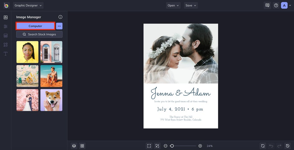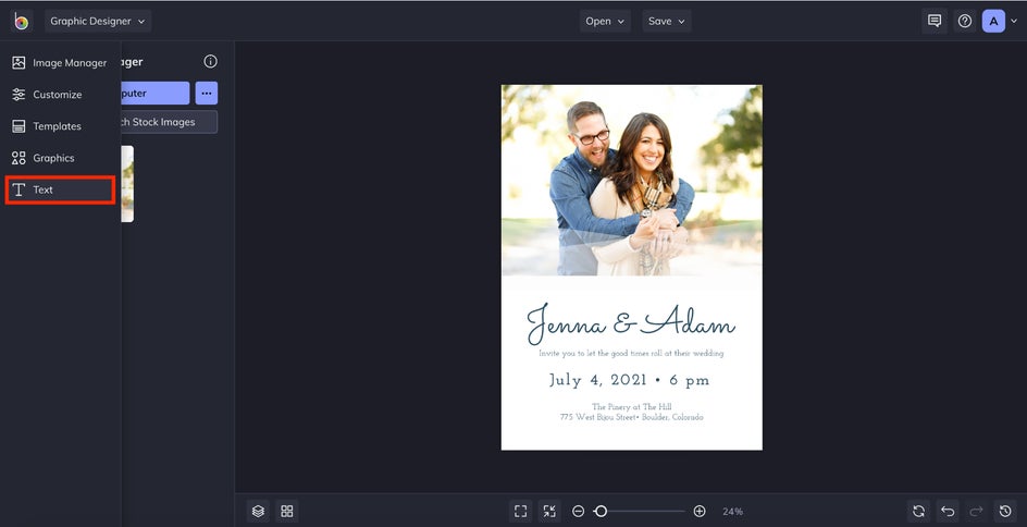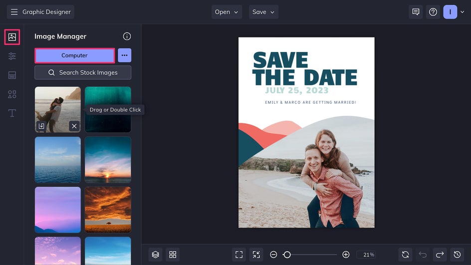 If you’ve chosen a save the date template that uses a photo, head to the Image Manager to upload a favorite couple or engagement shot. From there, just drag and drop one onto the canvas to replace the placeholder image.