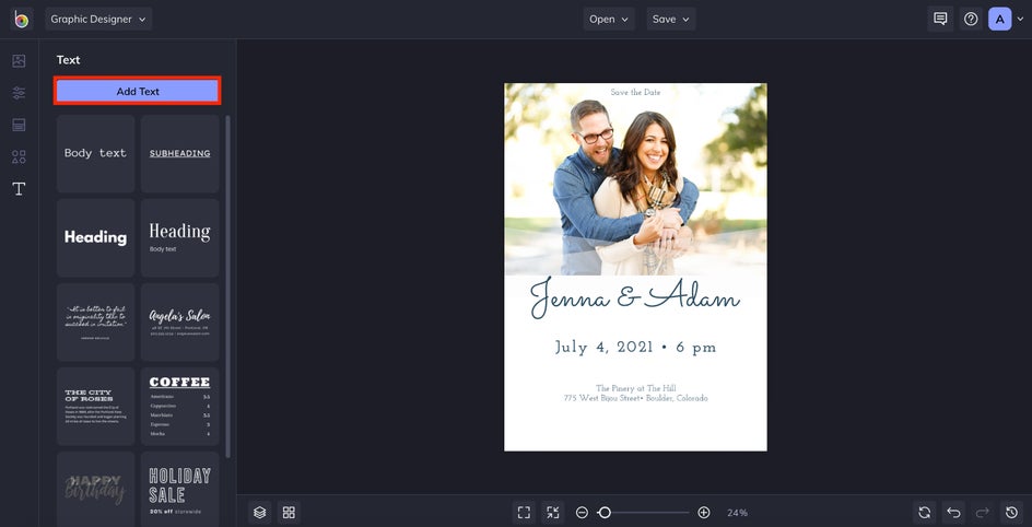 Now it’s time to make changes to the content, font, and color palette. Upload custom fonts or choose from the Designer’s many options using the Text tool. Click on any design element to change its color, or go to the Customize tab to change the background color.