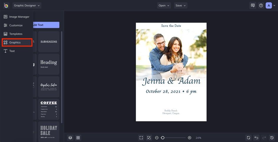 The Graphic Designer makes it easy to design custom save the date cards, whether your wedding theme is minimalist, floral, classic, modern, or bold. Better yet, you can build every design – including the invite, menu, and thank you card – around a unified look using beautifully coordinated wedding sets. These customizable wedding templates offer dozens of professionally designed, editable layouts that let you create every wedding printable in one place, with matching fonts, color schemes, and design motifs.