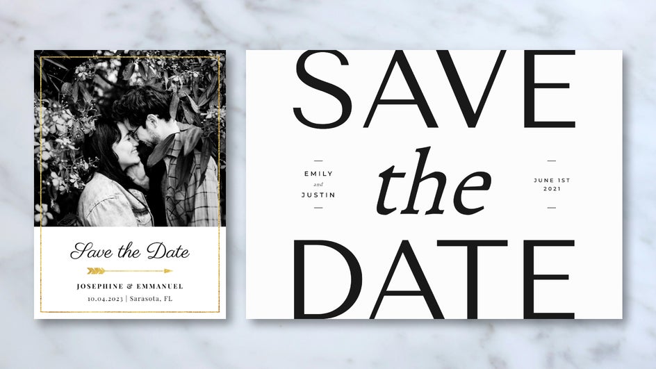 If your wedding leans more classic, consider a minimalist save the date theme. These templates feature crisp fonts and clean lines for a look of understated elegance. Apply a black and white effect to photos to keep the design looking timeless. Add a touch of gold shine to the text with a clipping mask, or use a subtle monogram of your combined initials as a graphic element. Simplicity can make a big impact, especially when extended across an entire wedding set.