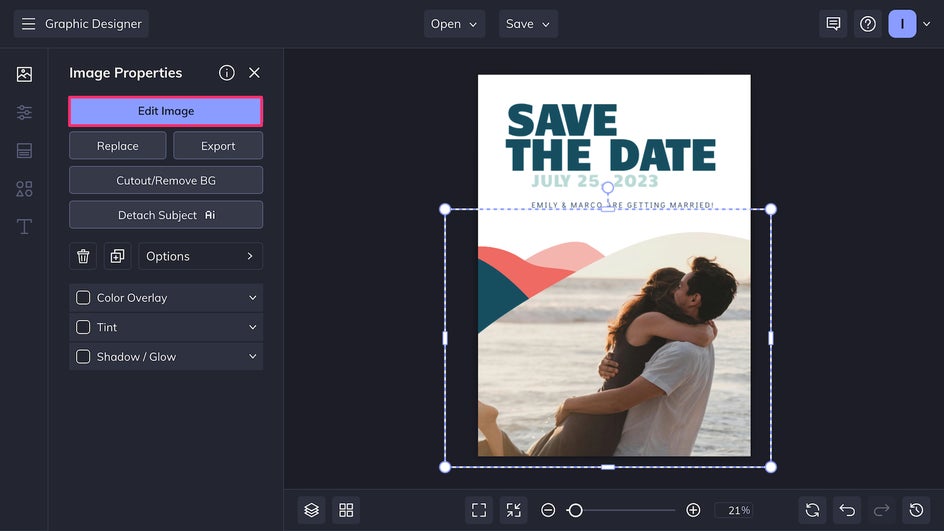 To enhance the card template with photo edits, click on a photo and select Edit Image. This will bring you to the in-platform Photo Editor without needing to open a new tab.
