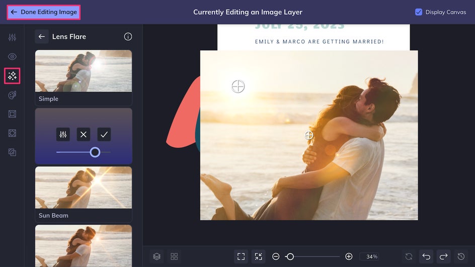 Here, you can straighten the image for better composition, apply toning filters and effects, or even remove the background to create a more minimal look. Here we’re adding a lens flare to make this romantic moment even more magical.