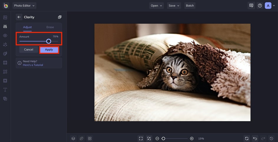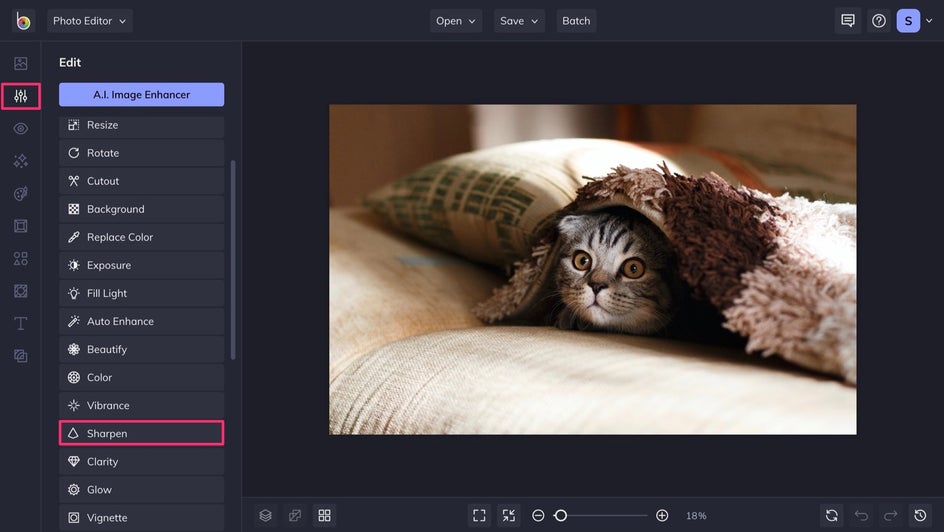 If you’re not sure whether to use Sharpen or Clarity on a photo, try both to see which result you prefer – each tool can be applied in a single click, so it’s not a time-consuming process. For especially blurry or grainy images, using BeFunky’s AI Deblur or Denoise tool may be more effective.