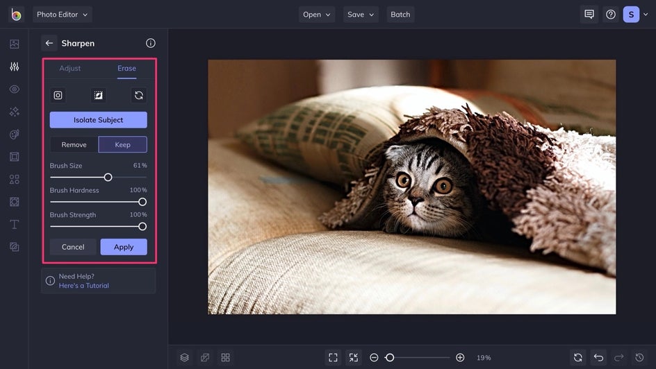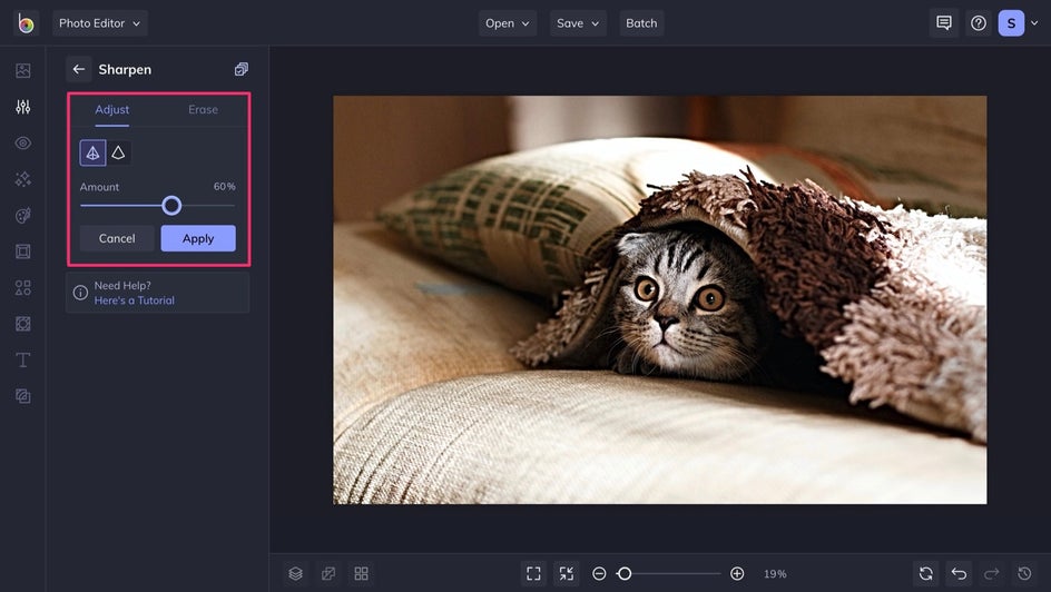 Once you select a photo, the Sharpen tool will take effect immediately. You can use the Amount slider to adjust the intensity of the results.