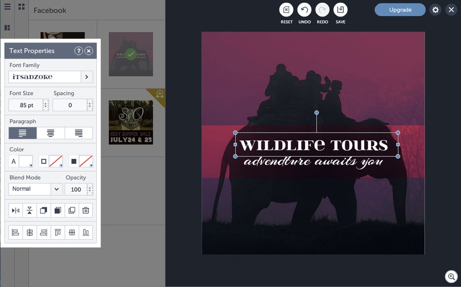 You can add each of your brand colors to your color Library for easy access. Plus, use the “Color Overlay” or “Tint” features in the Image Properties tab to change the hue of photographs and graphics. This will help make sure your social media designs match in color and tone across the board.
