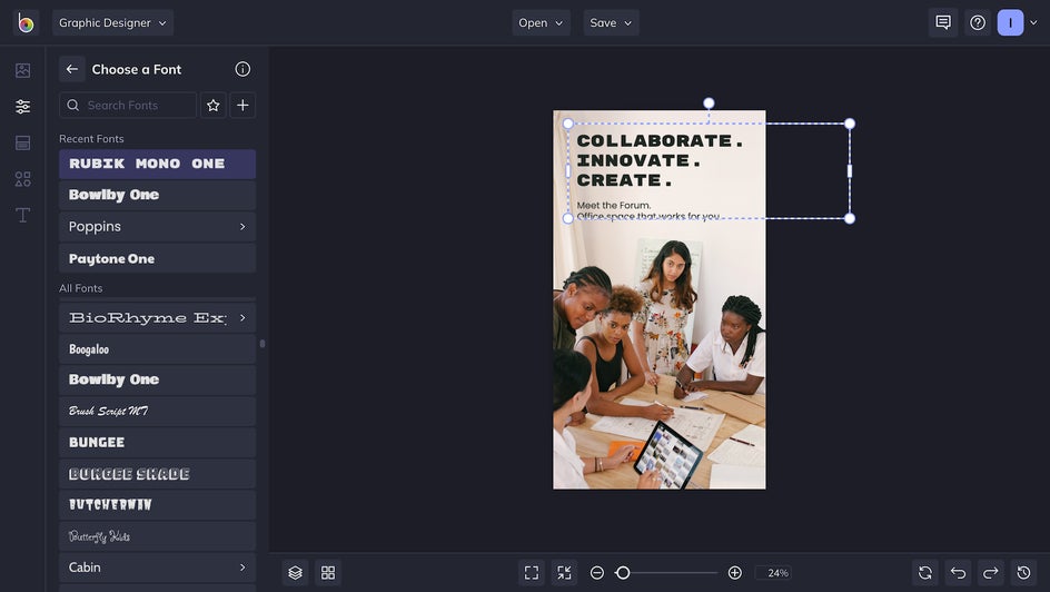You can find hundreds of different typefaces in the Graphic Designer, but if none of these do the trick, you can always add a Google Font or import your own.