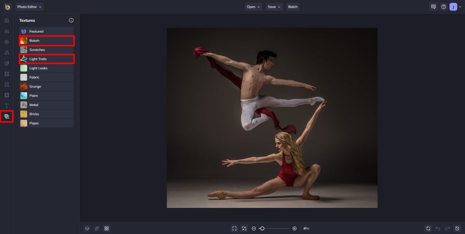 The Textures tab is home to some brilliant light effects like Light Leaks and Light Trails. Adding these light effects to your backgrounds is an easy way to add some interest and flair to your photos.