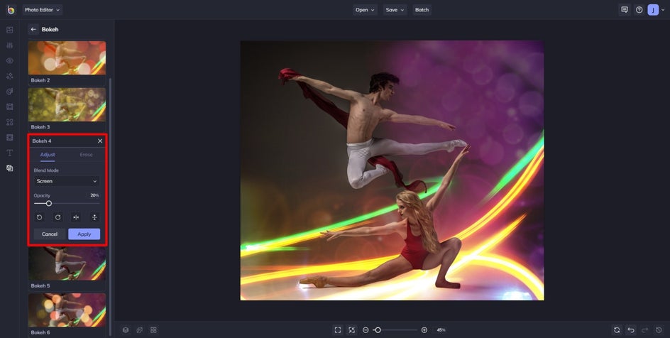 In photography, bokeh can happen when you focus on your subject and blur light sources in the background or use a dedicated Bokeh lens. The cool thing is, you can get this look in post-process by creating a texture for your background with BeFunky's Bokeh options.