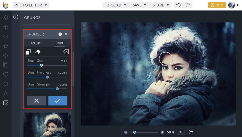 When you click on a Texture, it’s previewed as an overlay on top of the entire photo - but with BeFunky, you have total control over which parts of the photo you actually want to add texture. Preview the Textures until you find one you like for your background. Click on the Settings Menu and then click on Paint in the right corner to access Paint Mode.