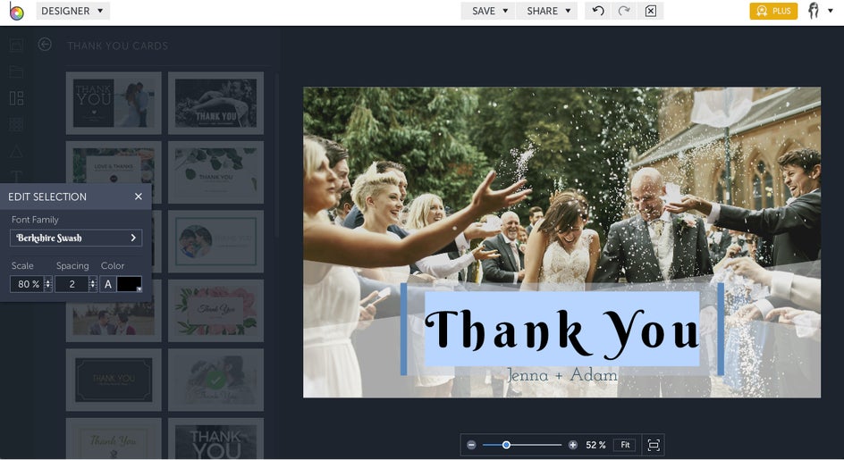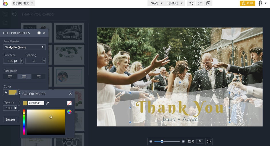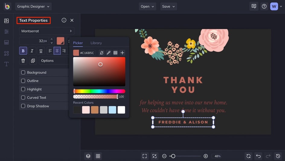 Next, you’ll want to change the message on your thank you card to reflect your gratitude. To do so, double-click any textbox on your template and type something new. You’ll notice a Text Properties menu appear on the left any time you have a textbox selected. Use this menu to change the font, color, letter spacing, and more!