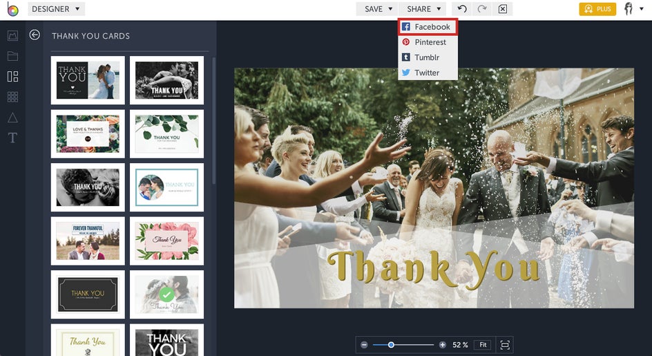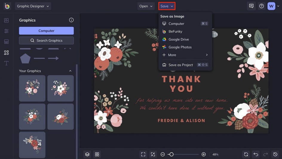 We recommend saving your Thank You Card as a PDF to keep it in high resolution if you’re planning on printing, and as a project, just in case you need to make any future changes.