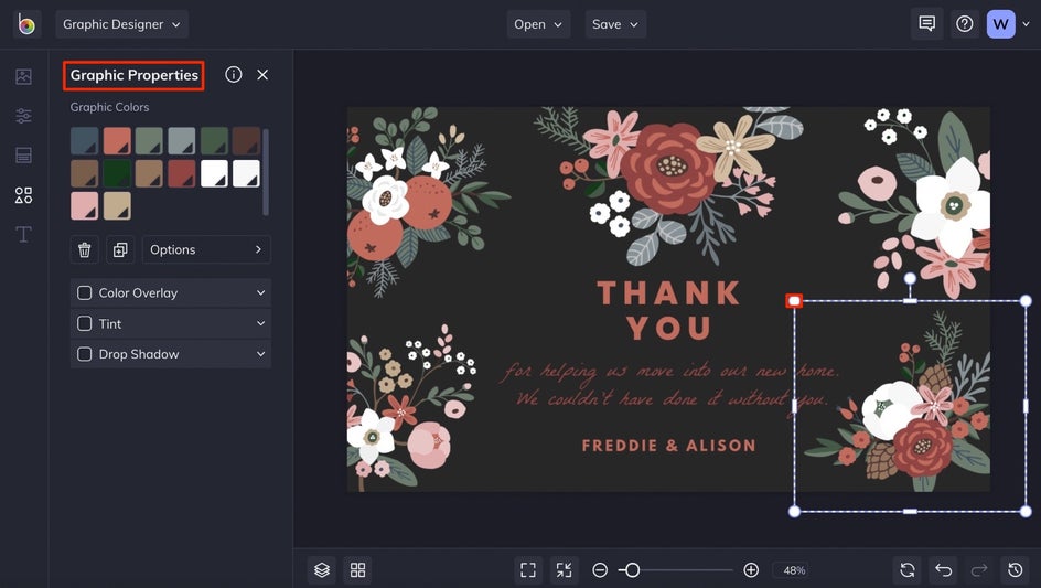 Use the Graphic Properties menu that appears on the left to customize the colors, add a drop shadow, and more. If you need to delete any graphics on your template in the design process, simply select the graphic and press the Delete button on your keyboard.