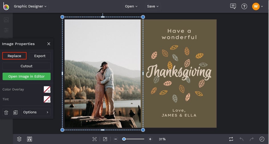 Once your template has loaded, it’s time to swap out the existing photo for one representing you or your family. You can do this by clicking on the image and then selecting Replace from the Image Properties toolbar which appears.