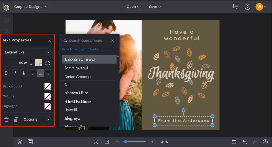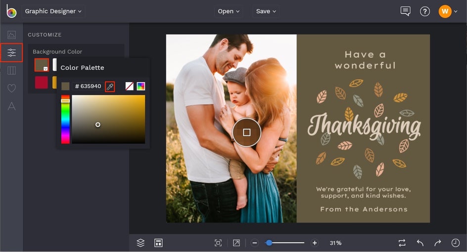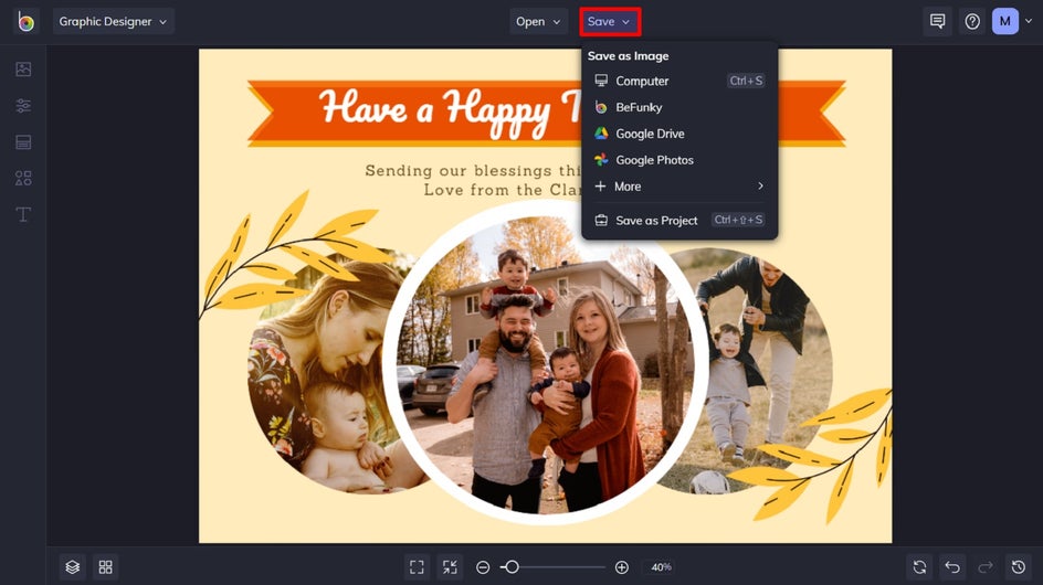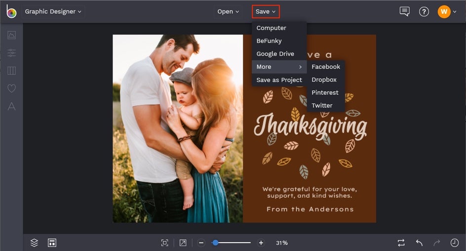 Once you’re happy with your Thanksgiving card design, all that’s left to do is save it so it’s ready to share with your loved ones – either digitally or by printing it out and mailing it to them. Click Save at the top to save your work to your computer, as well as Facebook, Dropbox, and more!