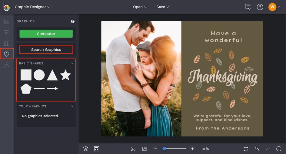 If you want to add some additional, fun elements to your card, click on the Design Elements in the main menu on the left. You can choose from Basic Shapes or click Search Graphics to access BeFunky’s huge library of clip art, symbols, lines, and more. You can even type Thanksgiving into the search bar in the top-left of the library to find graphics related to the holiday.