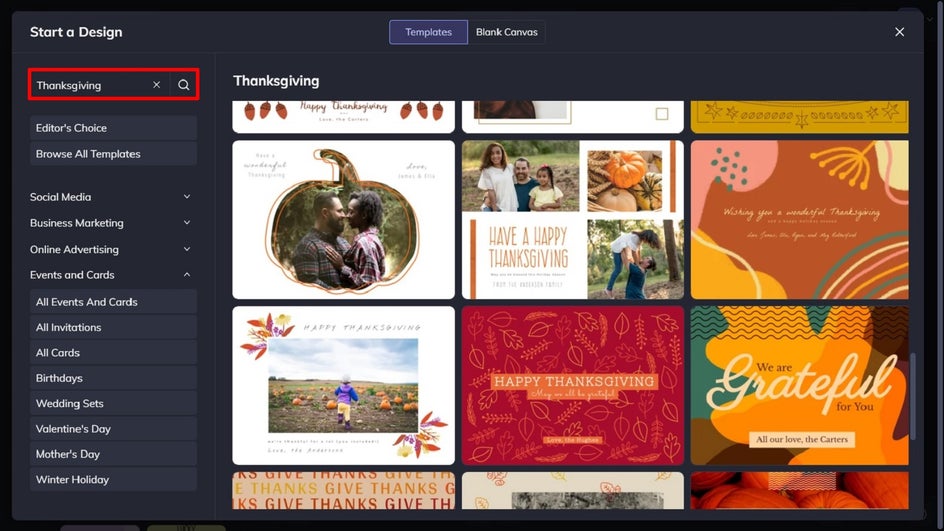 Our Card Maker will take you directly to our huge library of card templates. To narrow your search down, type Thanksgiving into the search bar in the top-left of the screen. This will bring up all of the Thanksgiving-themed templates in the Template Library. Simply select a card design that takes your fancy, then click Use This Template to begin editing it.