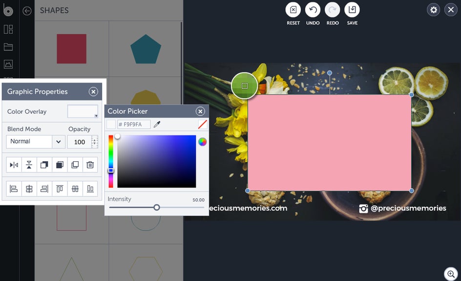 For this example, we’re going to stick with simple geometric shapes. Inside the Graphics Library, we clicked on Geometric Shapes in the leftmost menu under Popular Tags. This brings up a huge library of options. Select the graphic of your choice the same way you chose a background image earlier. The graphic will appear to the left of the graphic designer under Your Graphics.