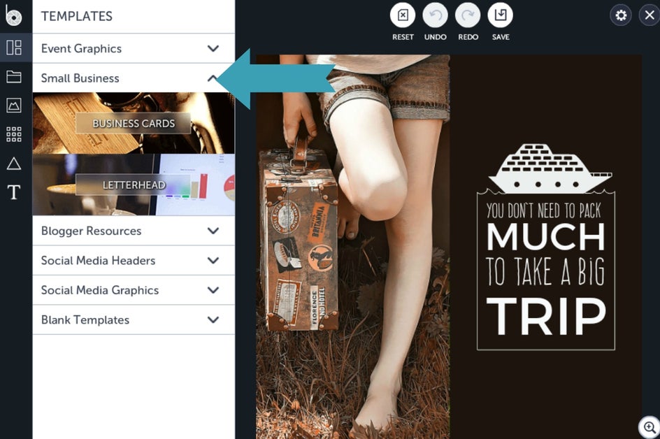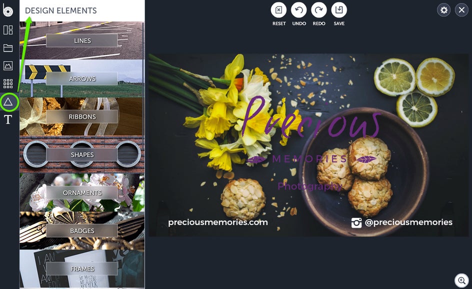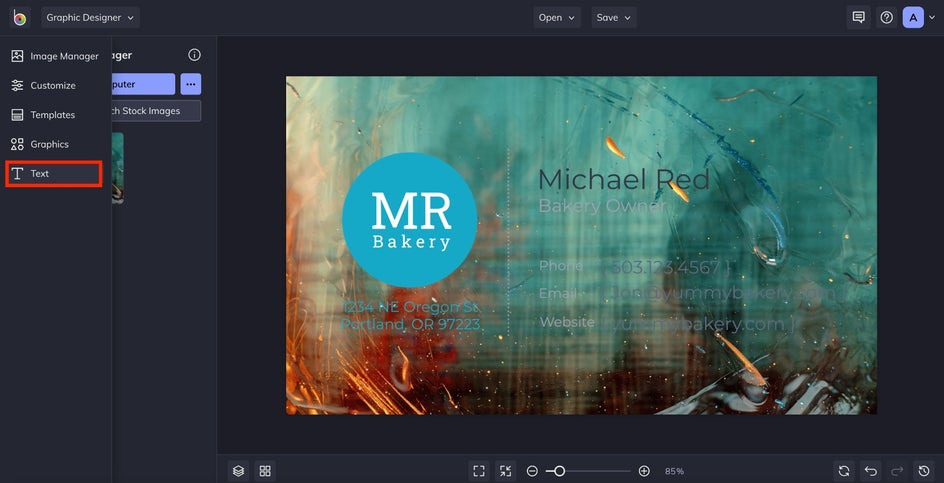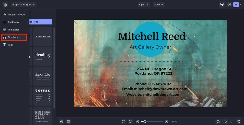 After you’ve updated your business card’s text, it’s time to experiment with adding visuals. Move your cursor to the leftmost icon menu to find the graphics menu. Click Graphics to enter this part of the graphic designer.