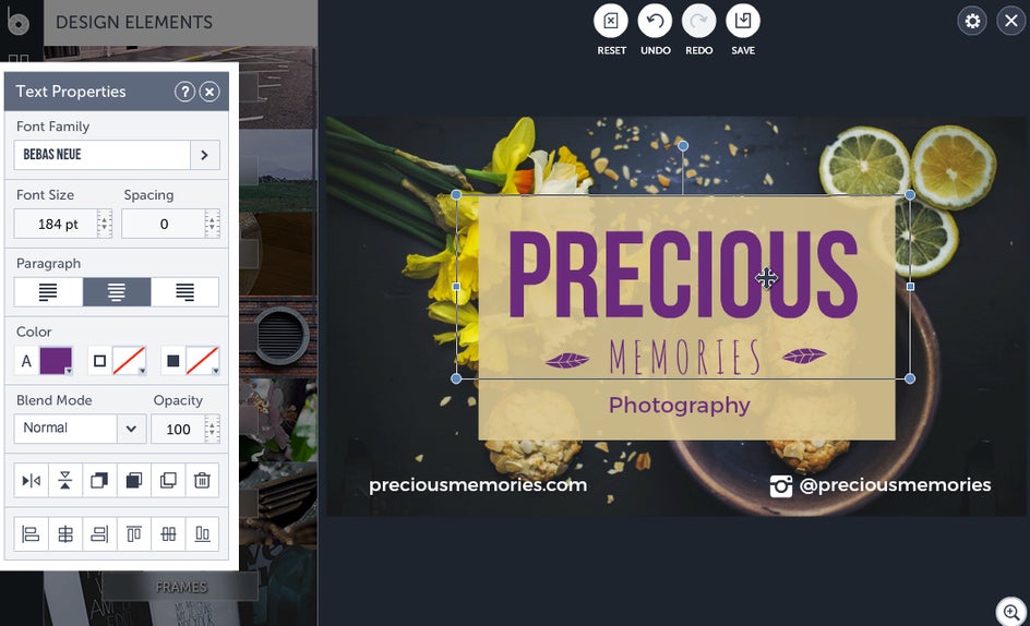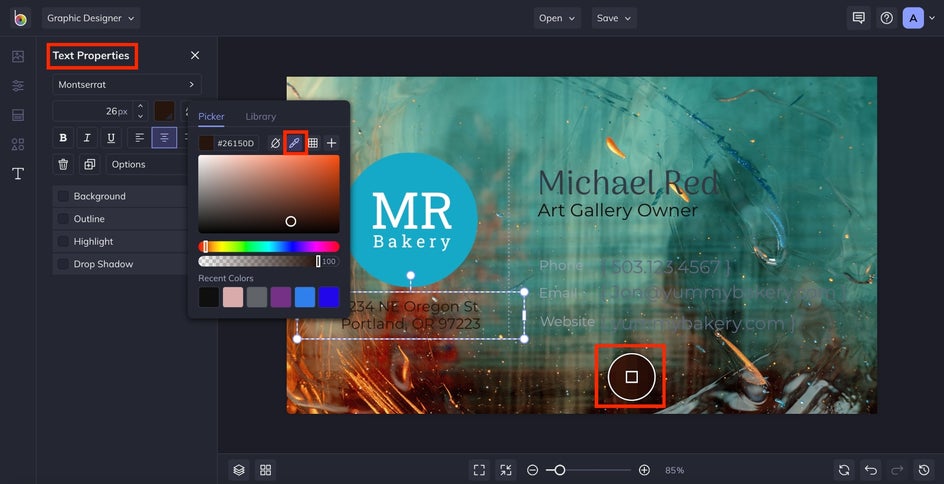 By clicking on the text on the business card, you can update the font, size, and other features in the Text Properties box on the left side of the graphic designer.