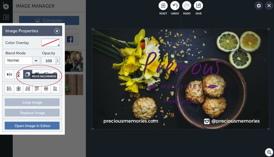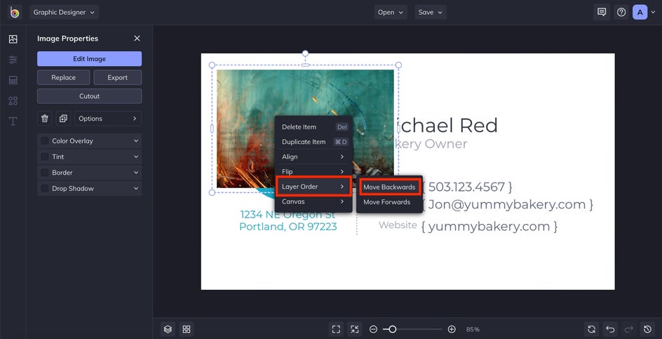 Double click or drag the image to place it on your business card. Right-click on the image and move your cursor down to hover over Layer Order. Click Move Backwards. This will place the image behind the template’s preexisting text. Repeat this step as many times as necessary until the image is behind all the text.