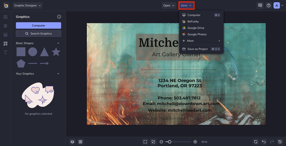 The final step is to save your new business card. Click the Save dropdown menu and save the business card to your computer, Google Drive, or elsewhere. Nice work! You’ve just made your own stunning business card that current and potential clients are certain to love.
