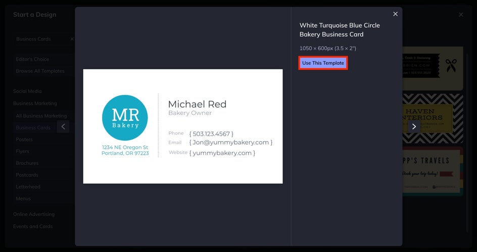 First, head to the Business Cards Templates category. Here, you can select one that best represents your brand – keeping in mind that you will have full editing power soon.