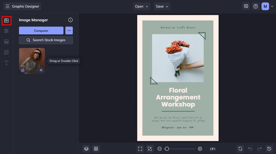 The first thing you’ll need to do is to change the template’s existing photo (or photos) for one that represents what your workshop is all about. To do this, navigate to the Image Manager in the main menu on the left. From here, you can upload a file from your computer or click Search Stock Images to use a stock photo from our library.