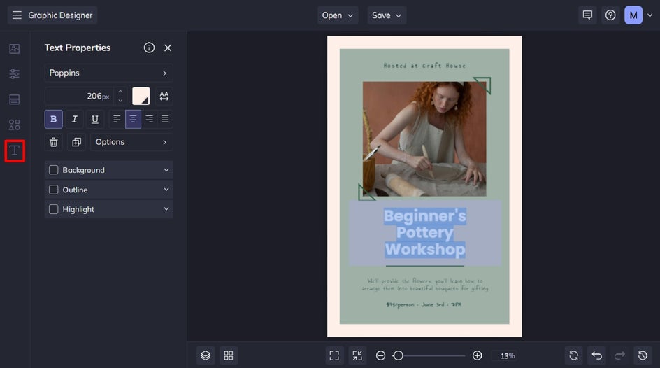 Next, you’ll need to edit your poster template’s existing text to include your own workshop’s information. Double-click any text box you wish to change, and you can simply type what you want it to say. From the Text Properties panel which appears when you click on a text box, you can also adjust things such as the font, text size, text color, spacing, and more.