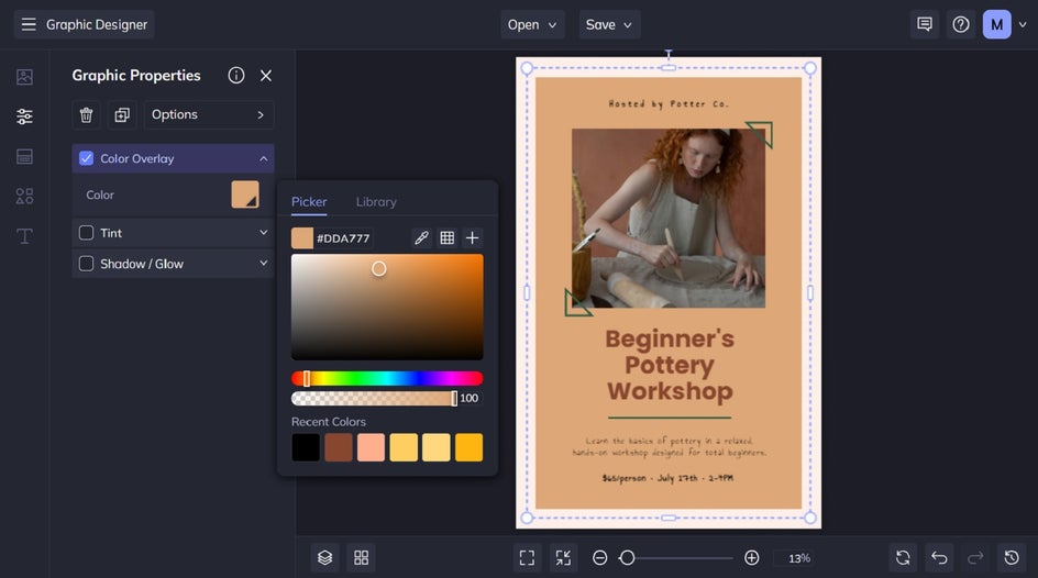 Want to change the colors of any graphics that appear on your workshop poster design? Just click the graphic or shape you wish to change, and a Graphic Properties panel will appear. From here, you can adjust the color overlay, tint, drop shadow, and more.
