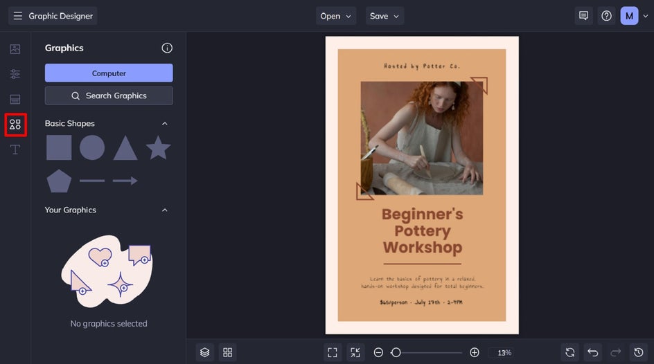 You can also add more graphics by clicking on Graphics in the main menu on the left. You can add some basic shapes to your poster design, or click Search Graphics to access our huge library of clip art, symbols, illustrations, and more. Once selected, drag and drop the new graphics onto your canvas and adjust accordingly.