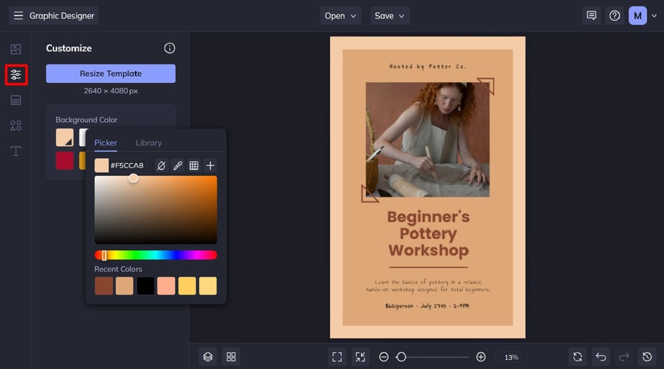 To change the background color of your workshop poster design and make it more in-line with your branding, navigate to Customize in the main menu. Then, select a new shade from the color swatches. Clicking the first swatch will open the Color Picker, from which you can choose any shade you had in mind.