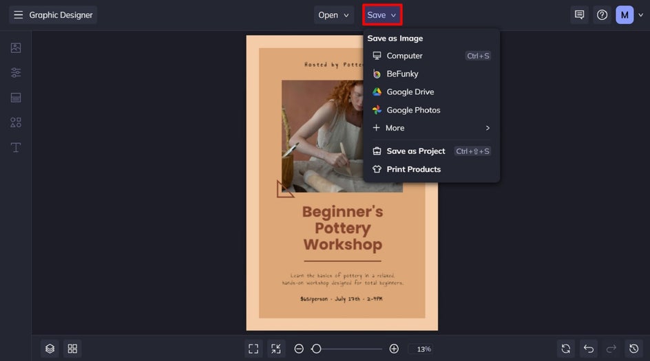 Once you’ve finished designing your workshop poster, all that’s left to do is to save it so it’s ready to print. Click Save at the top of the screen, then select Computer.