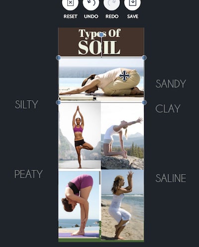 Next up, I'm going to delete all the stock photos from the template we selected, and upload my own photos. I've got a photo for each yoga pose, all uploaded here through the Image Manager!