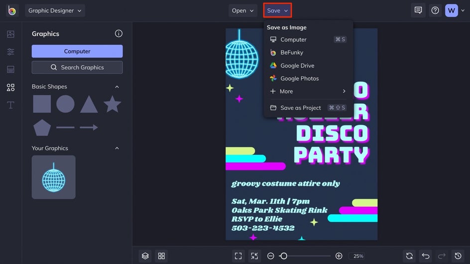 When your themed party invitation is looking amazing, click the Save button at the top of the page. You’ll be presented with several options for saving your work.