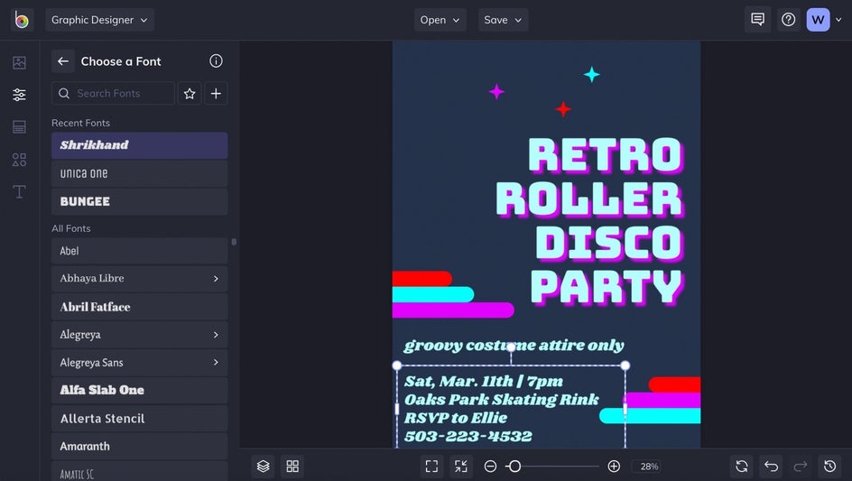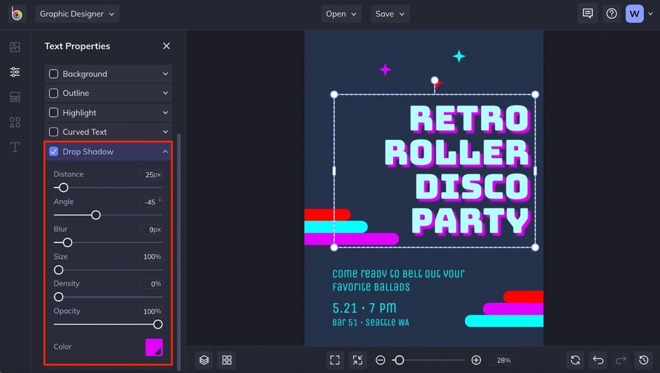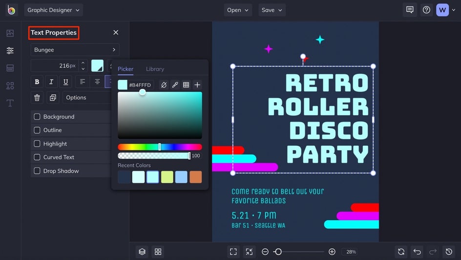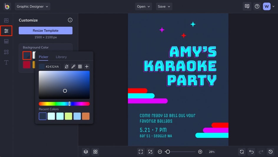 If there are graphics on your party invitation already that you want to customize, simply click on any graphic and use the Graphic Properties menu on the left to change the color, opacity, and more. We decided to keep the retro-looking graphics and change up the color scheme just a little bit.
