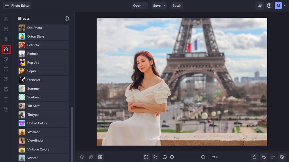 Once your photo is uploaded, navigate to Effects in the main menu on the left. Then, choose a photo effect category to explore. For your “then and now” photo, we recommend selecting a photo effect from the Black and White, Old Photo, Sepia, or Tintype categories.