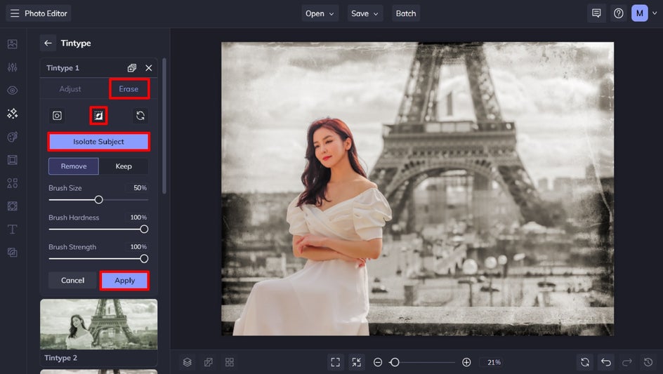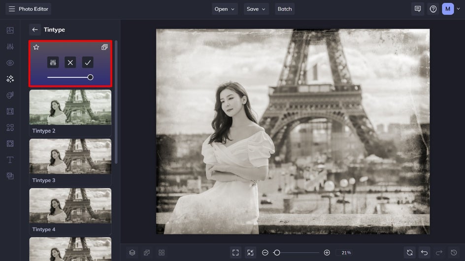 In this tutorial, we’ll be using the Tintype 1 photo effect.