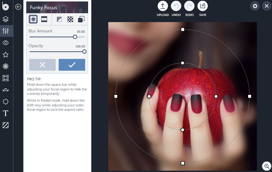 From left to right, you have 1) Radial mode (concentric circles) 2) Linear mode (lines, duh) in terms of the shape you’d like to use when blurring your image. I find that radial works well for instances in which you’re trying to highlight a specific area of the photo—product photography is a great example of this in action—while linear tends to favor landscape shots.